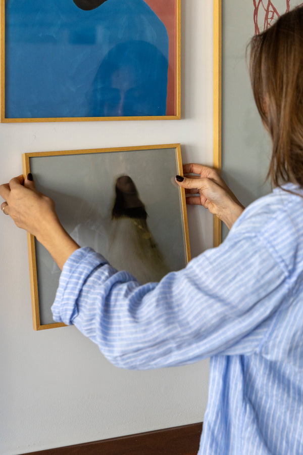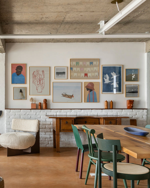 A nova seleção de obras ocupa a sala de estar e jantar, criando uma galeria que dialoga com o azul do sofá e o tom terracota do piso. Entre os destaques está o trabalho de Fernanda Santos, uma das artistas preferidas de Carol, que já conhecia a curadoria da BOEMI e se encantou com os lançamentos mais recentes.