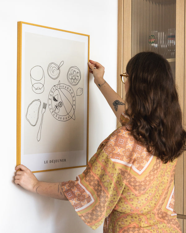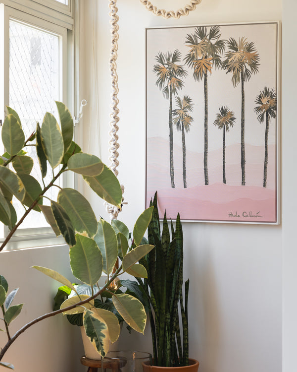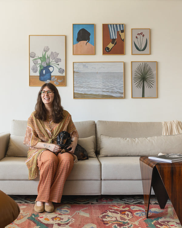 Na sala, a composição reúne obras de diferentes artistas, entre eles Paula Calderón e Fernanda Santos, em diálogo sutil entre formas e cores. As pinturas se integram à atmosfera do ambiente, refletindo o olhar delicado da moradora e o equilíbrio entre arte e natureza. No hall de entrada, uma obra de Paula ganha destaque, enquanto outras peças da BOEMI completam o lar com leveza e significado.
